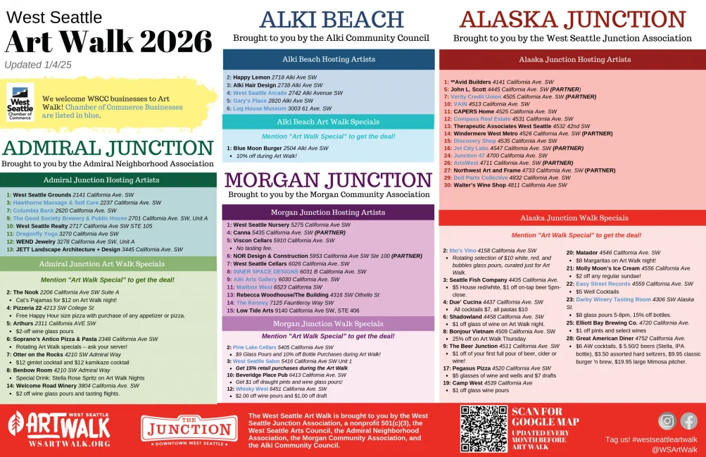 WEST SEATTLE ART WALK! Second Thursday means a celebration of art all around the peninsula, with most receptions running 5-8 pm. Here’s the venue list: