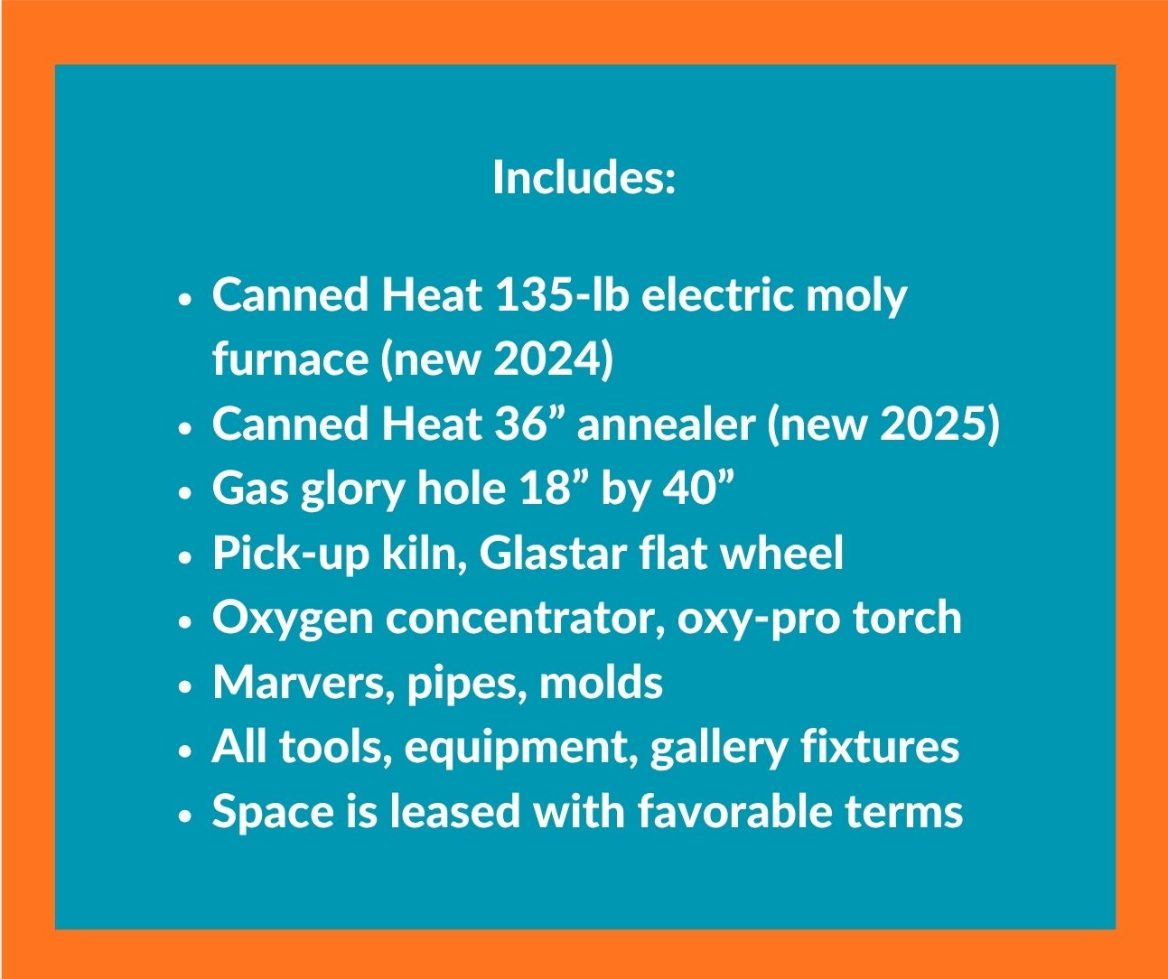 They and their landlords – the Bennett family – really want the space to remain a glass-blowing shop, the Felixes say. They’ll be turning it over in good condition, with newer equipment (the sale flyer has specs), and they hope there’s an experienced glass blower who’s ready for their own studio/shop, “somebody with the likelihood of succeeding,” out there.