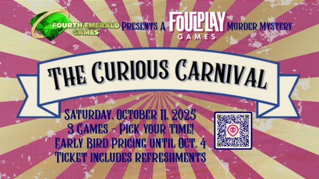 Experience “The Curious Carnival,” a murder mystery event with Foulplay. Take on the role of various circus performers and work to uncover the murderer who ruined the act. Your ticket includes refreshments and two drink tickets from Revelry Room. There will be three games throughout the day — pick your preferred time.