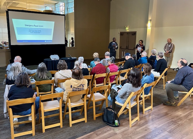 After a brief delay to resolve technical difficulties with the projector, first up was Robert Lee to talk about the California Avenue emergency culvert repair, which is happening this month. Lee said the project was fast-tracked as an emergency (which needed to be done prior to the larger replacement that will likely begin in 2028) because the pipe is “in really bad shape.” The team does not believe it will last two years without intervention, hence an emergency approach with expedited design, permitting, and coordination.
