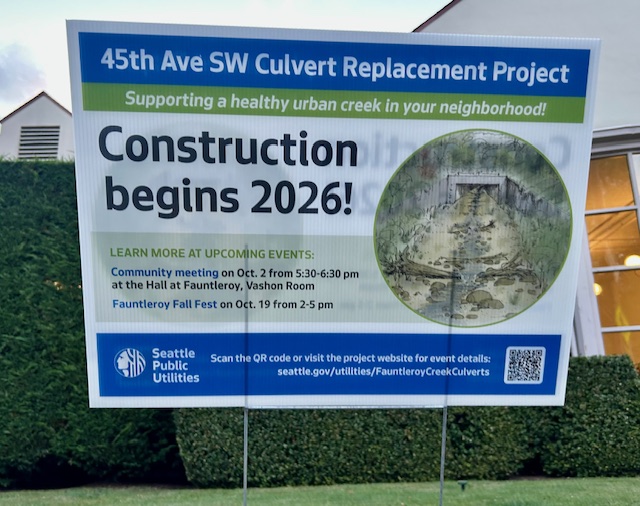 Neighbors and project coordinators agree that it’s crucial to get the word out and to keep the community involved, and Thursday night’s meeting was part of that ongoing effort. Project reps will also be onsite to answer questions at the upcoming Fauntleroy Fall Festival, happening Sunday, October 19 from 2-5 pm, as noted on signage posted in the area: