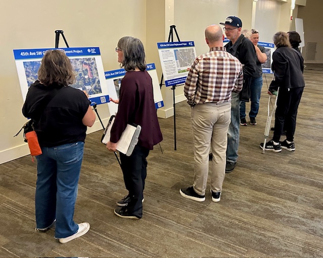 Presenters on Thursday night included Robert Lee (SPU project manager for the emergency repairs happening this month), Jonathan Brown (SPU project manager for the 45th Ave SW culvert replacement), and Tracy Belding (design consultant for the 45th Ave project). Also in attendance were reps from the Seattle Police Department — crime prevention coordinator Matthew Brown and officer German Barreto — to answer questions and represent public-safety aspects of the projects.