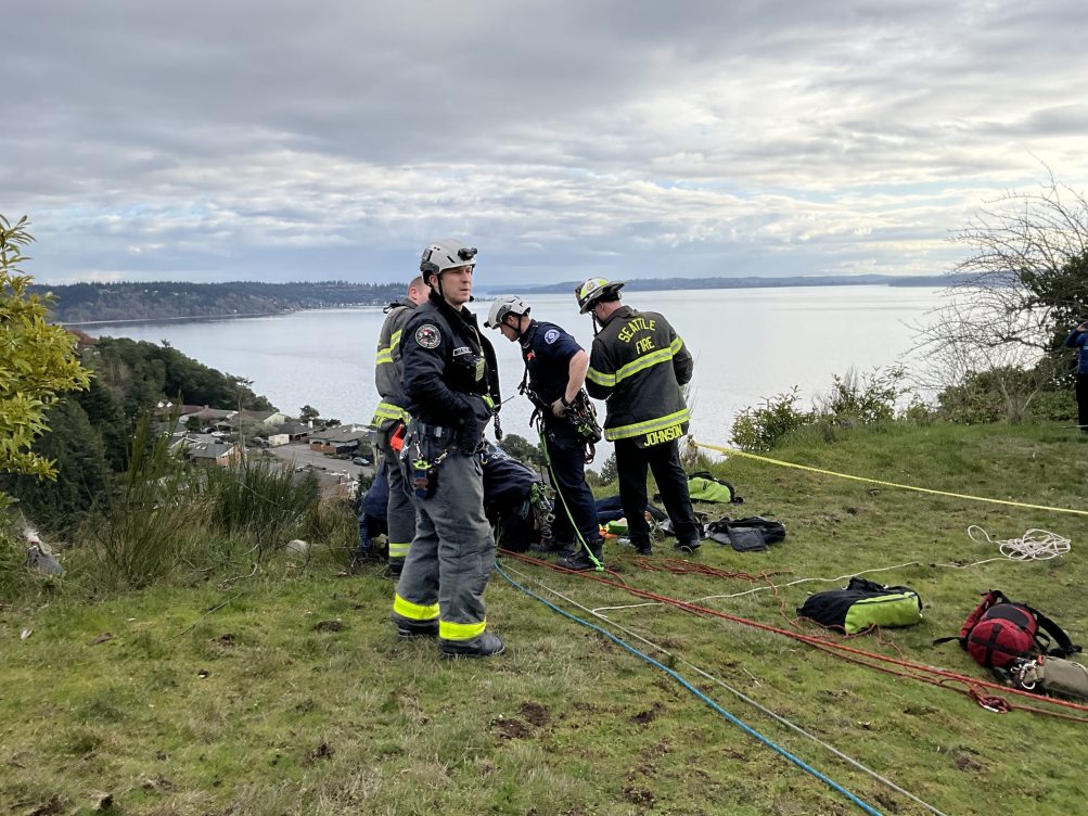 Thursday, we reported on Seattle Fire crews rescuing “two large dogs” from a 30-foot embankment in The Arroyos. It was in an off-the-beaten-path-enough area that there was no way we could get there for photos, so we asked SFD if their crew might make any available. Today, they did, above and below: