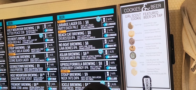 Unusual menu-board item at Ounces (3809 Delridge Way SW) this afternoon – cookies and beer! The beer garden/tap room is suggesting pairings today, while Troop 42099 is there selling cookies on the second weekend of cookie-booth season: