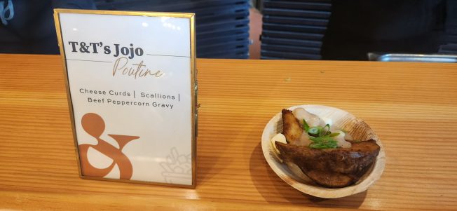 6:53 PM: Gotta show you the food at Food Fest. Above, Tuxedos and Tennis Shoes Catering’s jojo poutine; below, Wildwood Market’s tomato, basil, and housemade croutons: