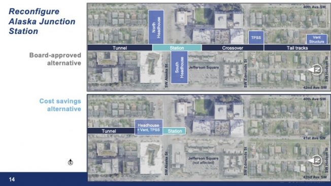 2:17 PM: The briefing, led by ST’s Brad Owen, is beginning, starting with a sheaf of background. Owen says “independent cost verification” has validated their projections. ST’s Jason Hampton, WS project director, then takes over. He says some of the smaller cost-cutting measures can just be incorporated into the design process, such as right-sizing Duwamish River guideway components. Those are the first level (“lever”) changes. In the second “lever,” they’d include various technical changes and also “removal of the tail track” so the “crossover” could be in front of the Junction station.