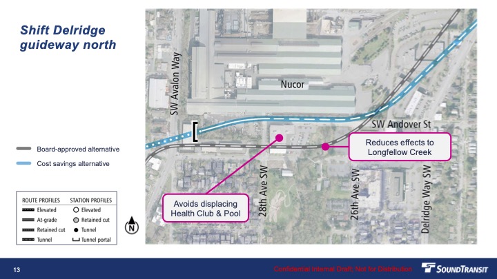 Then the Delridge guideway would shift northward, sparing West Seattle Health Club and reducing effects on Longfellow Creek: