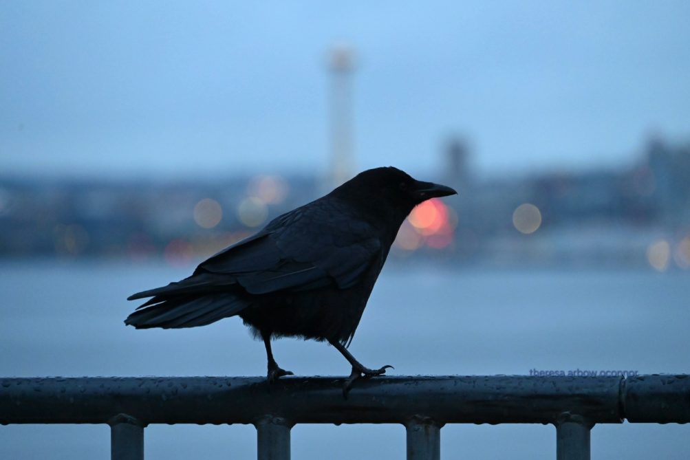 (Somewhat soggy crow, photographed early today by Theresa Arbow-O’Connor)