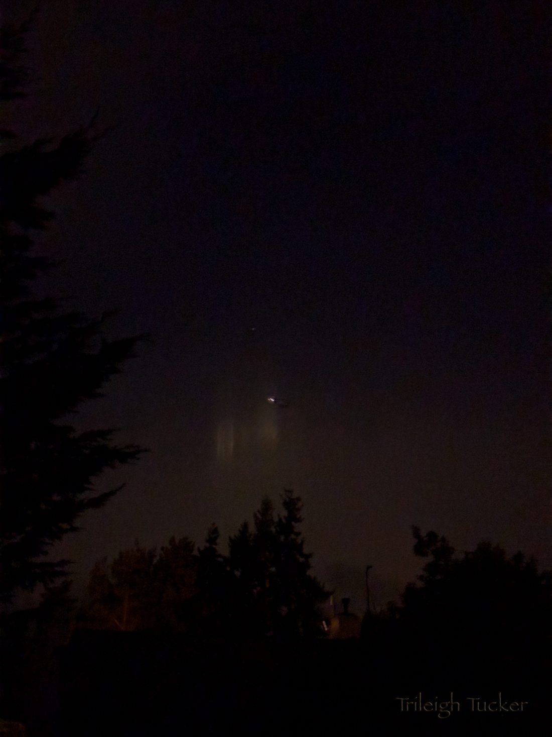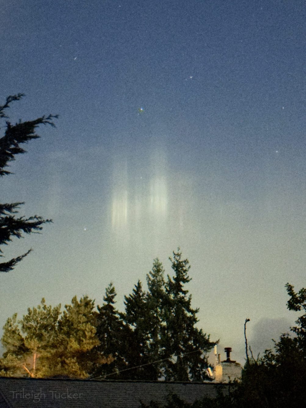 When I woke up this morning and wandered into our kitchen to make tea, I looked out the window to see if there were any stars—and saw this unusual display to the west! These are “light pillars,” and form when the atmosphere is cold enough that any moisture in the air freezes into flakes. Since “flakes float flat,” they act as little mirrors that bounce surface light to our eyes, which we perceive as vertical pillars. Wikipedia does a good job of explaining them.