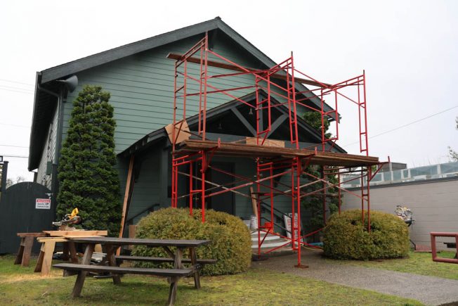 What was originally the Olympic Heights Social Hall has been closed since midsummer but not empty – it’s been a hive of renovation work, and some of it is continuing up to the last minute before the first of four reopening events, an Industry Mixer 6-8 pm tonight.