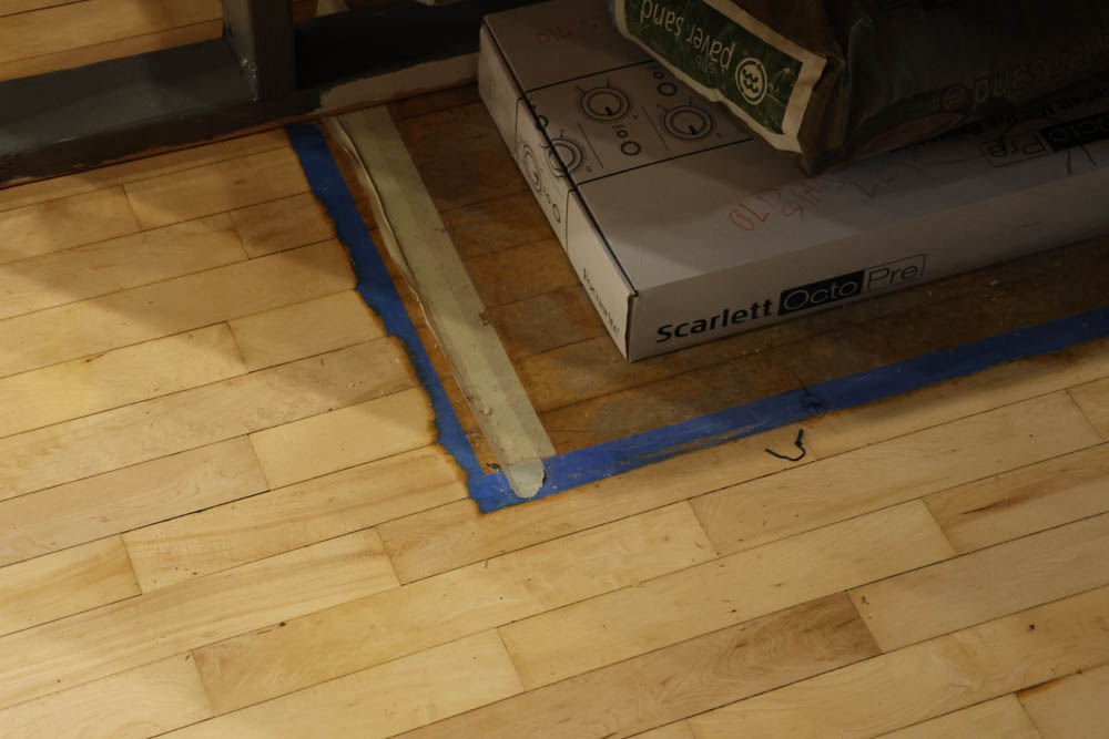 Kenyon Hall’s Murphy Janssen let us visit for a quick preview this morning. Most of the renovation work isn’t something that you’d notice immediately upon entry unless you are familiar with Kenyon Hall in intimate detail – the newly sanded and refinished floor, for example, is the original maple flooring, only, Murphy says, but it’s now “danceable” – no more concern that your foot might catch a splinter or snag. Here’s a section of unrefinished floor contrated with the new, lighter look: