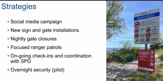 In recent years, summer hours and patrols at Alki Beach (and Golden Gardens) have started around Memorial Day and ended around Labor Day. This year, the city Board of Parks and Recreation Commissioners was told tonight, they’ll start earlier and end later – May 1 through September 30. While the “Summer of Safety” briefing did not get into specifics like park hours, some other details were discussed such as plans for more patrols by Park Rangers, police, and Animal Control, plus larger signs about park policies, and a “really fun” social-media campaign including the mayor and police chief.