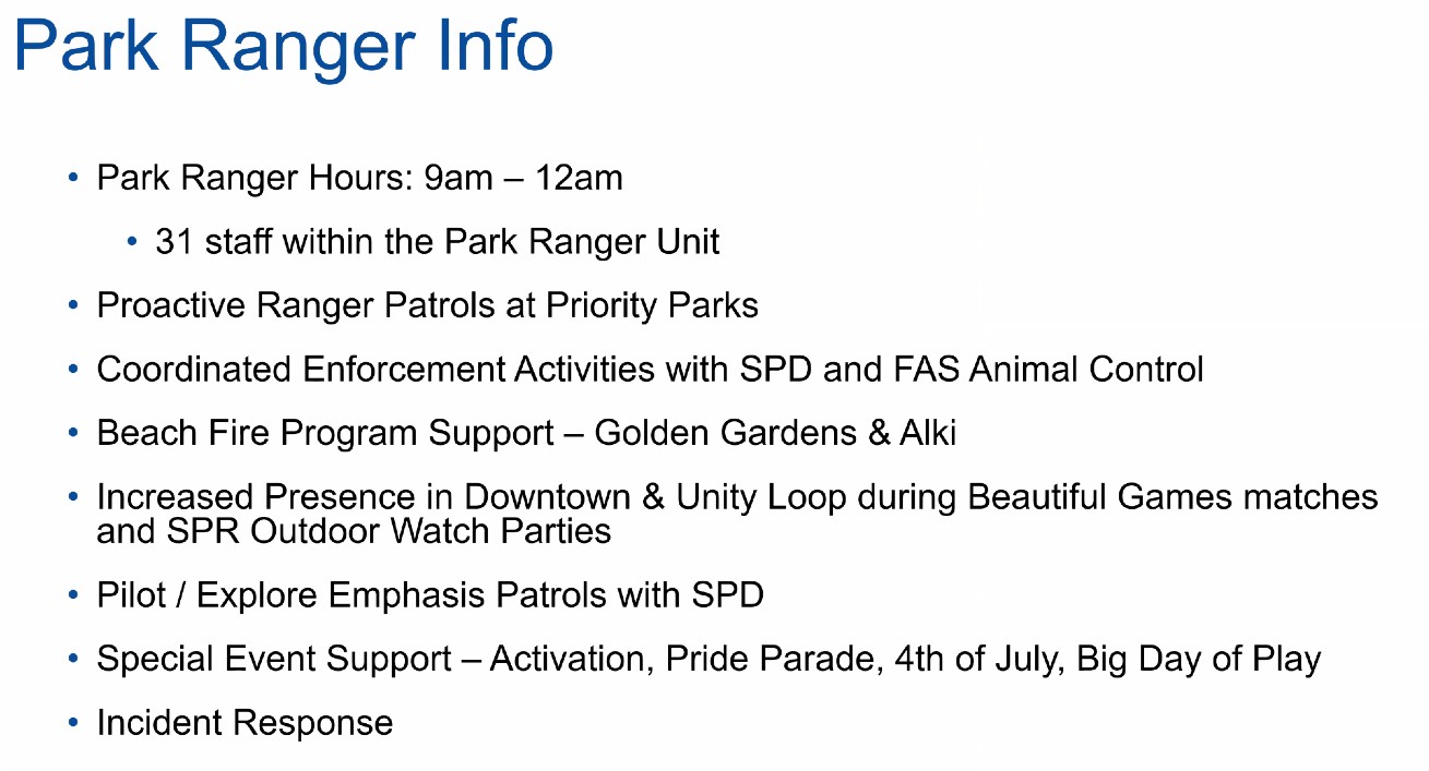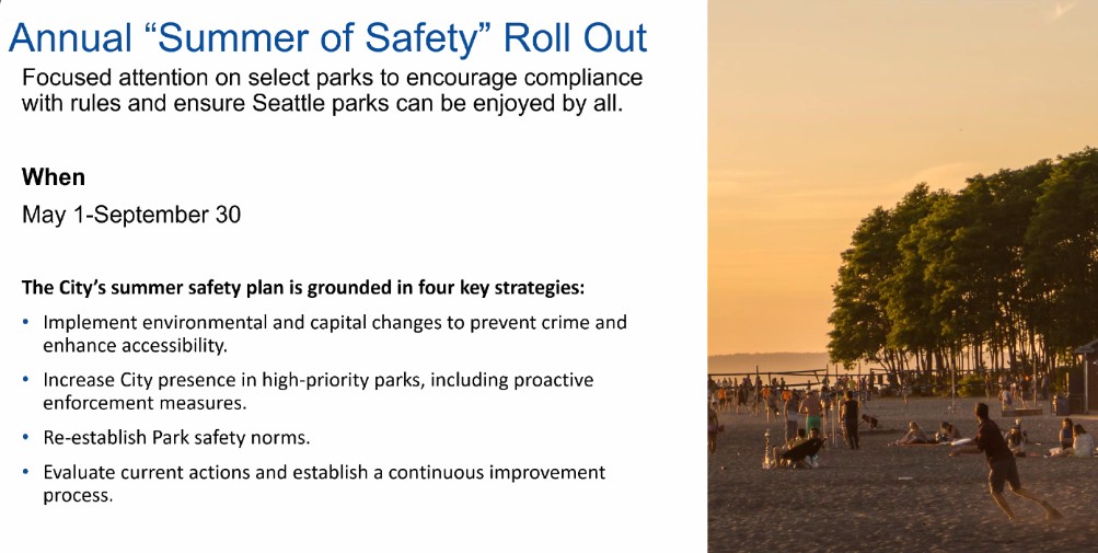 In recent years, summer hours and patrols at Alki Beach (and Golden Gardens) have started around Memorial Day and ended around Labor Day. This year, the city Board of Parks and Recreation Commissioners was told tonight, they’ll start earlier and end later – May 1 through September 30. While the “Summer of Safety” briefing did not get into specifics like park hours, some other details were discussed such as plans for more patrols by Park Rangers, police, and Animal Control, plus larger signs about park policies, and a “really fun” social-media campaign including the mayor and police chief.
