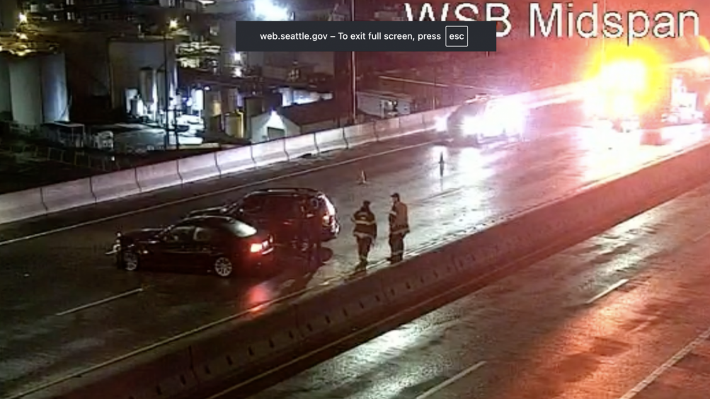 11:56 PM: Not cleared yet; SDOT crews are in place east of the collision scene, to warn traffic to go around it by using the outside westbound lane.