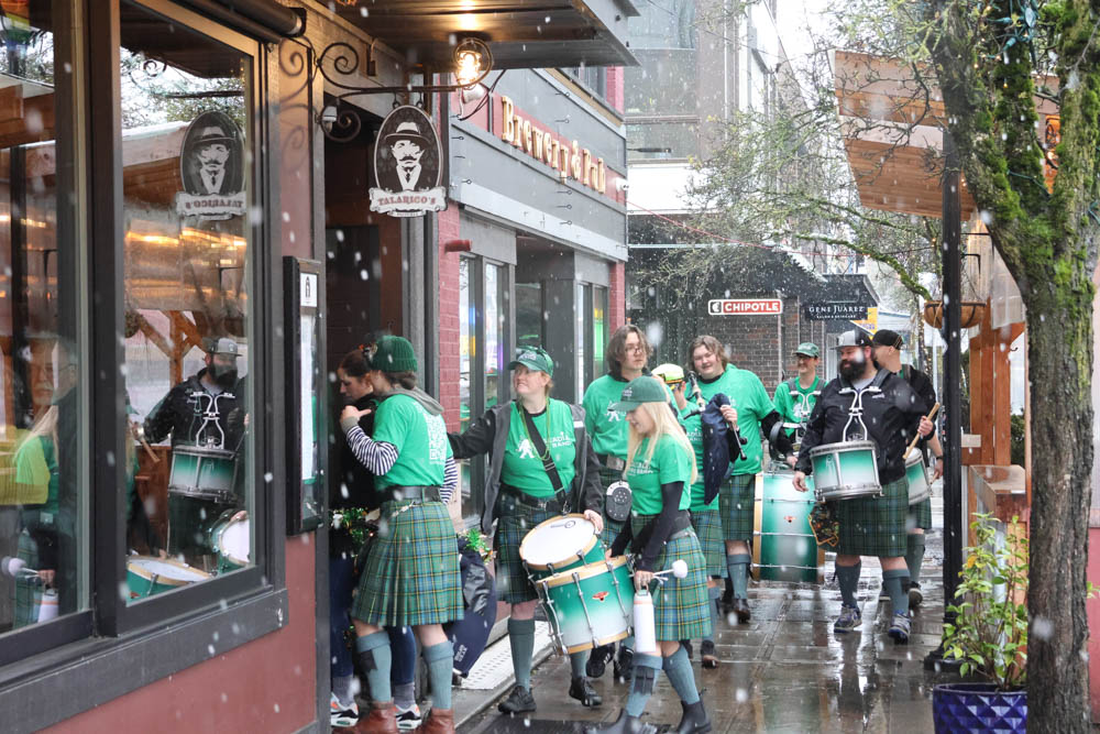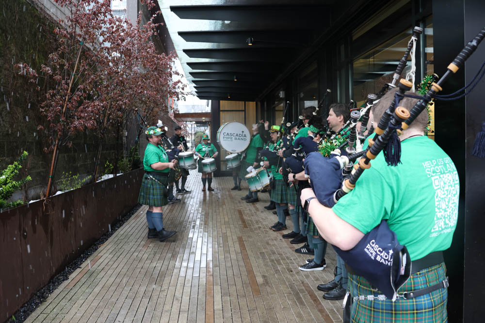St. Patrick’s Day is four days away, but the Wearing of the Green has commenced in West Seattle, as the Cascadia Pipe Band defied the snow and showed up for their planned West Seattle Pub Crawl. Talarico’s Pizzeria was the first stop: