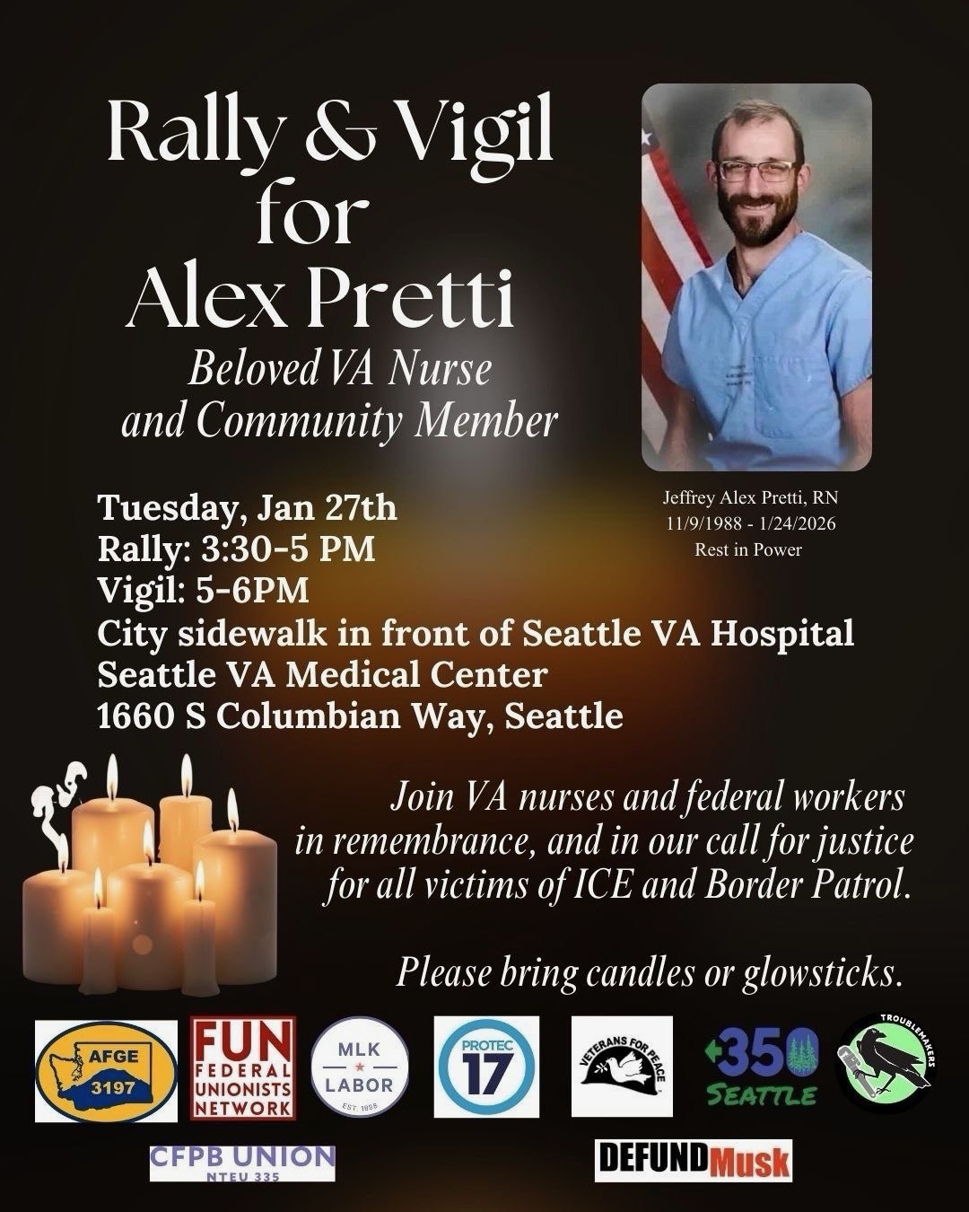 She also mentions that she and the others were headed home when they learned federal agents had killed Alex Pretti. Meantime, another reader sent word that a rally and vigil in honor of Pretti, a VA nurse, is planned Tuesday night outside the Seattle VA hospital on Beacon Hill.