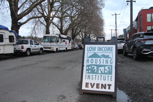 The meeting’s location also provided a visual reminder of the homelessness crisis and its RV tensions along Seattle streets, with RVs parked across South Homer Street from the church, bordering a park – and lines of ecoblocks along properties to the west, a common preventive measure deployed in unofficial attempts to prevent RV parking.