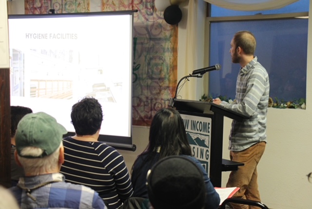 LIHI’s senior construction project manager Matthew White offered more details of the site plan. Since they’re only using part of the WSDOT-owned property, he said, there will be two fences, interior and exterior. All entries will be via the front gate, with 24/7 security (these are paid staff members, Kidane confirmed when we asked, knowing that at sites like CSC security had been the responsibility of resident volunteers). LIHI staffers, including the site manager and three case managers, will have six offices to use. There will also be asphalt paths, security cameras, a kitchen, laundry room, and hygiene facilities with seven showers and eight toilets. And fire extinguishers would be available at least every 75 feet. Also, it’ll have outdoor community areas including smoking zones and picnic tables. Tiny houses, it was noted, all have heating and A/C. As for overall schedule, White said they’re “pushing very hard” to get this up and running in three months.