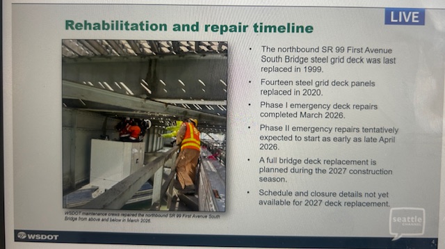 He said the northbound full-deck replacement is likely to happen next year, and it’s not unexpected as that bridge deck was replaced in 1999 and it was expected to last 20 to 25 years. The work starting later this month, Nielsen said, will include removing and replacing 10 deck panels that were temporarily repaired in March. When they start the work, it should last about a month, and they’re working hard to be sure that can be completed before the FIFA World Cup soccer matches in Seattle. He said bridge users should also plan for lane closures in the week before and after the construction to set up and remove scaffolding. For the repairs, they expect to use a combination of weekend and weeknight full closures. Extended weekend closures would span Thursday nights through Monday mornings. “Our goal is to identify a strategy that balances the speed of construction with the impact to the community,” said Nielsen, adding that WSDOT is planning an intensive campaign to inform those affected (freight haulers, commuters, port partners, transit operators).