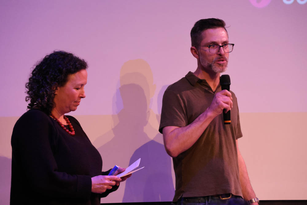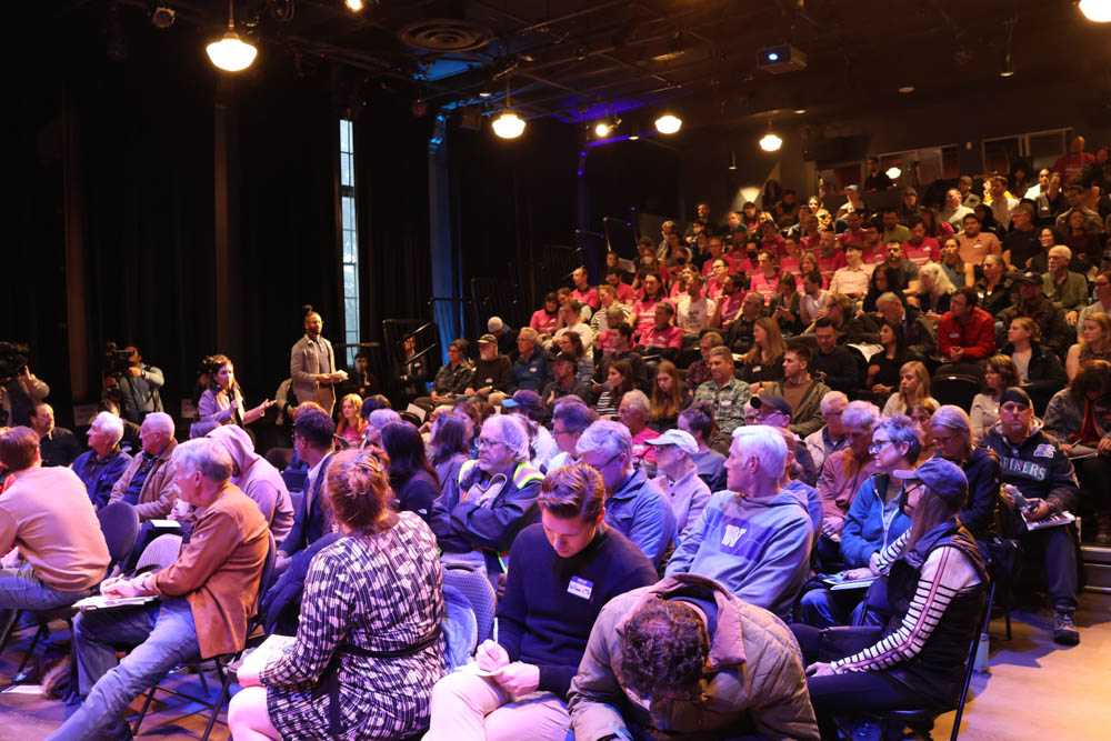 Youngstown Cultural Arts Center brimmed with people – including an overflow area (where Zumba would usually be happening this time). West Seattle Urbanism members were out in force, sitting together in the audience in special T-shirts, holding signs, and spiritedly applauding many of the points made.