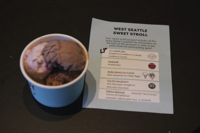 The West Seattle Junction Association‘s first-ever Sweet Stroll this afternoon was sweet indeed – the $20 tickets for tastes at five Junction venues were sold out days before the event. Photojournalist Dave Gershgorn captured some scenes for WSB. Above, A La Mode Pies was the starting spot, where ticketholders could pick up “passports” to get stamped at all five participating businesses for an entry to a prize drawing. The pie tastes they were offering were raspberry crumble a la mode and cookies & cream: