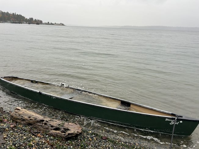 Thanks to the readers who’ve sent photos of that canoe, which turned up this morning on the west-facing beach at Lincoln Park